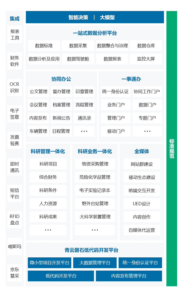 輔助決策平臺是基于科研數(shù)據(jù)和科研指標(biāo),利用先進算法、可視化、大模型等技術(shù),為科研決策者提供數(shù)據(jù)支持和建議的信息化系統(tǒng)。平臺為科研單位建立數(shù)據(jù)標(biāo)準(zhǔn),搭建數(shù)據(jù)中臺,將內(nèi)外部科研數(shù)據(jù)進行有機融合,讓科研決策者一手掌握本單位科研項目、經(jīng)費、資產(chǎn)、科研成果、人才隊伍建設(shè)情況,了解國家/同行業(yè)單位發(fā)展趨勢,找準(zhǔn)本單位科研水平所處位置,制定人才引進、經(jīng)費申請、資源配置相關(guān)制度和戰(zhàn)略規(guī)劃,從而提升本單位整體科研能力。